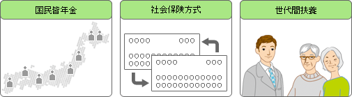 | 公的年金は、国民が安心して老後の生活を送れるように社会全体で支えるしくみになっています。その特徴は、「国民皆年金」、「社会保険方式」、「世代間扶養」の3つです。 |